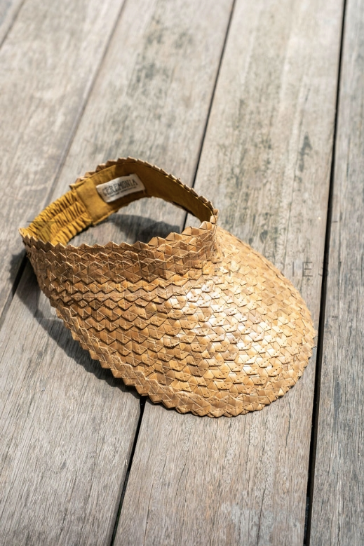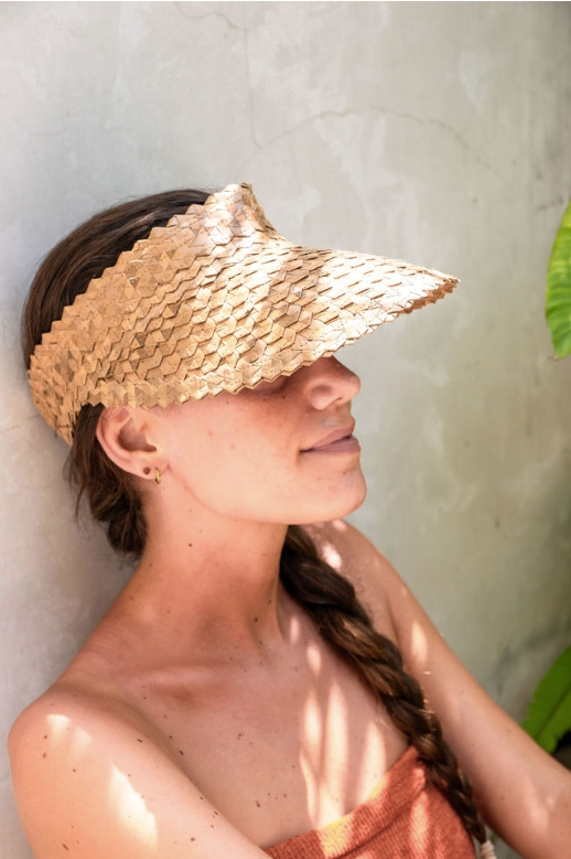 Our sun visors have been intricately woven by hand using palm leaves. They're stylish, compact for travel, help protect your face from the sun, and feature a comfortable cotton-lined elastic stretch band in the back. They're the perfect sunny day accessory, and available in neutral colors to compliment every outfit.